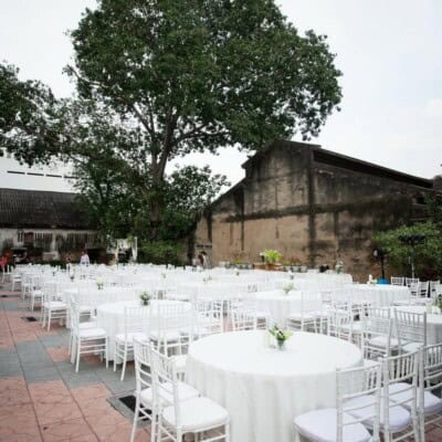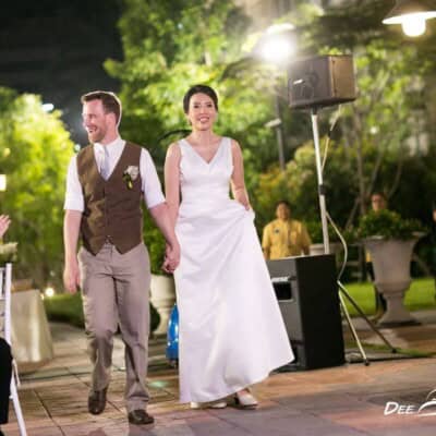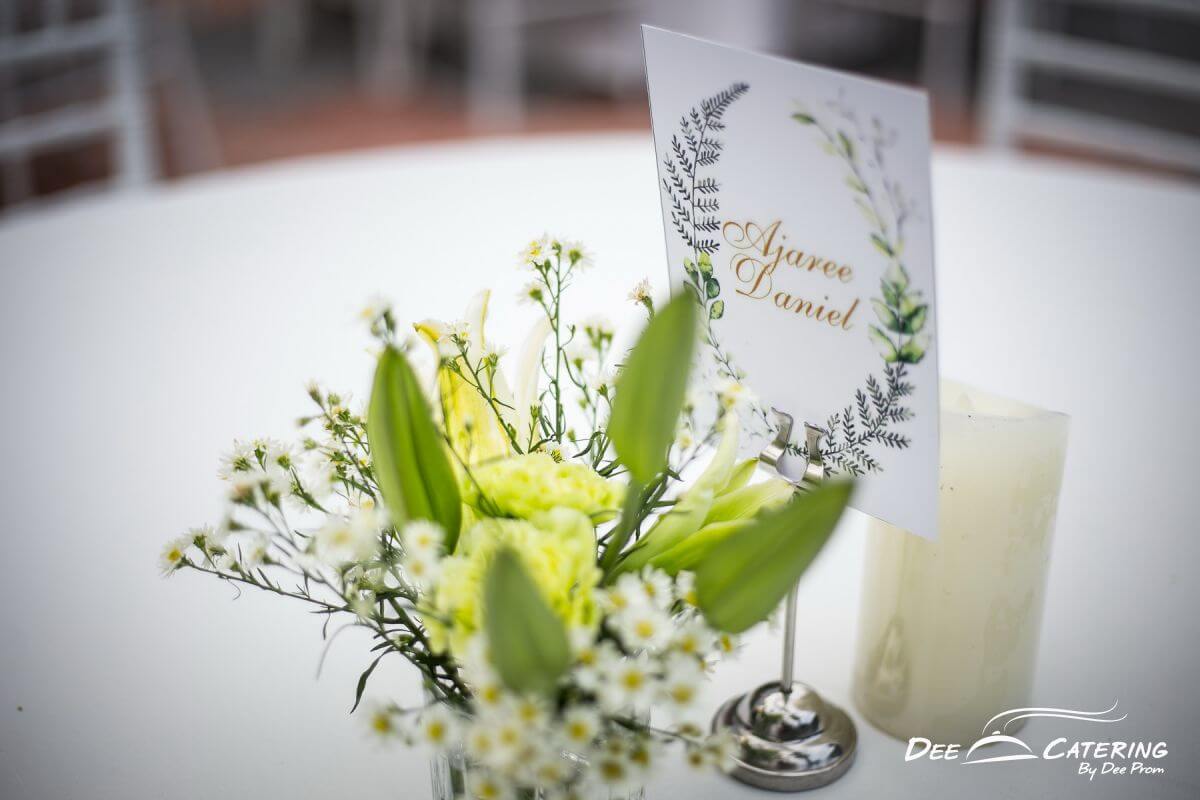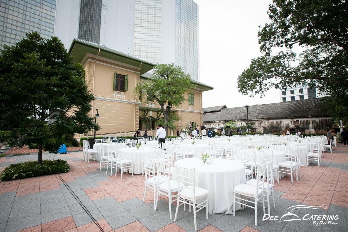 จริงๆ แล้ว บ้านเลขที่1 สถานที่จัดเลี้ยงแต่งงานหรืองานเลี้ยงต่างๆ ไม่จำกัดว่าจะต้องจัดงานในสไตล์ไทยประยุกต์เท่านั้น แต่ยังจัดงานในธีม Greenery สวยๆ สบายๆ ในบรรยากาศเอาท์ดอร์ด้านหน้าของ House No.1 ได้ด้วย ยิ่งงานแต่งที่ต้องการให้แขกกินอิ่มแบบจริงจัง พื้นที่สวนด้านหลังบ้านเลขที่ 1 กว้างพอที่จะจัดวางโต๊ะเพื่อนั่งรับประทานอาหาร และยังตั้งไลน์อาหารบุฟเฟต์ได้หลายมุม ดูตัวอย่างงานแต่งของบ่าวสาวคู่นี้ที่ทำให้ภาพการจัดเลี้ยงบุฟเฟต์ที่ดูเฉยๆ กลายเป็นงานที่ดูน่ารักแอบมีความคลาสสิกนิดๆ ด้วยสถาปัตยกรรมของ House No.1 สิ่งสำคัญที่จะช่วยให้งานดูดีคือเซ็ตโต๊ะที่เลือกใช้ เก้าอี้ชิวารีไม้สีขาวเก๋ๆ จะทำให้ภาพรวมของงานดูสวยขึ้นมาทันที และต้องไม่ลืมกิมมิกน่ารักๆ ให้เข้ากับธีม Greenery อย่างป้ายชื่อบนโต๊ะ ดอกไม้ที่นำมาตกแต่งไลน์อาหารบุฟเฟต์ หรือการเลือกเซนเตอร์พีซบนโต๊ะอาหาร ยิ่งบรรยากาศโดยรวมของบ้านเลขที่ 1 ที่มีต้นไม้เป็นแบ็กกราวนด์ ถึงจะไม่เยอะมาก แต่ก็พออัพความชื่นใจเวลามอง เรื่องเล็กๆ แบบนี้แต่สร้างความประทับใจให้แขกที่มาร่วมงานได้อย่างมากเลยล่ะค่ะ