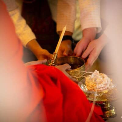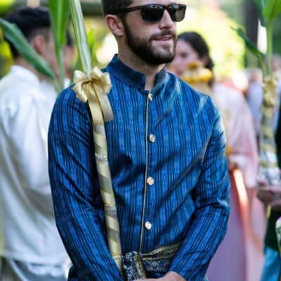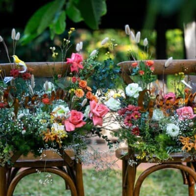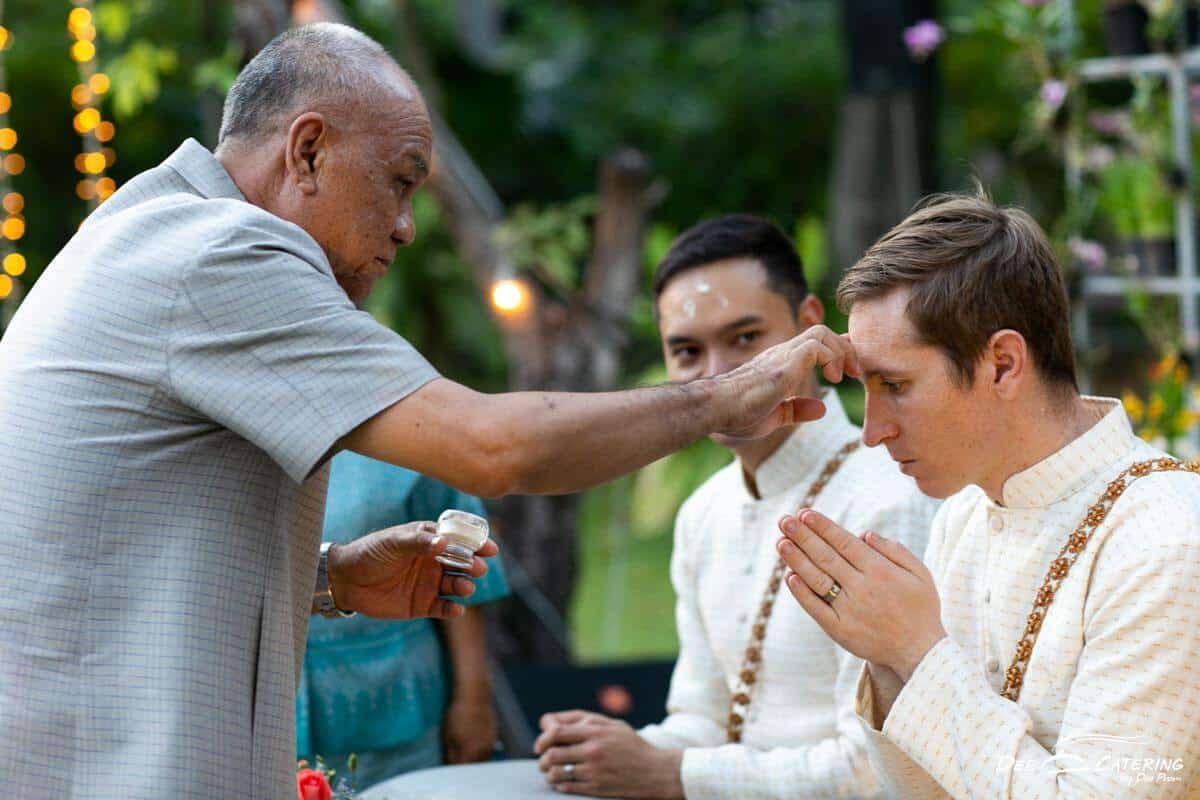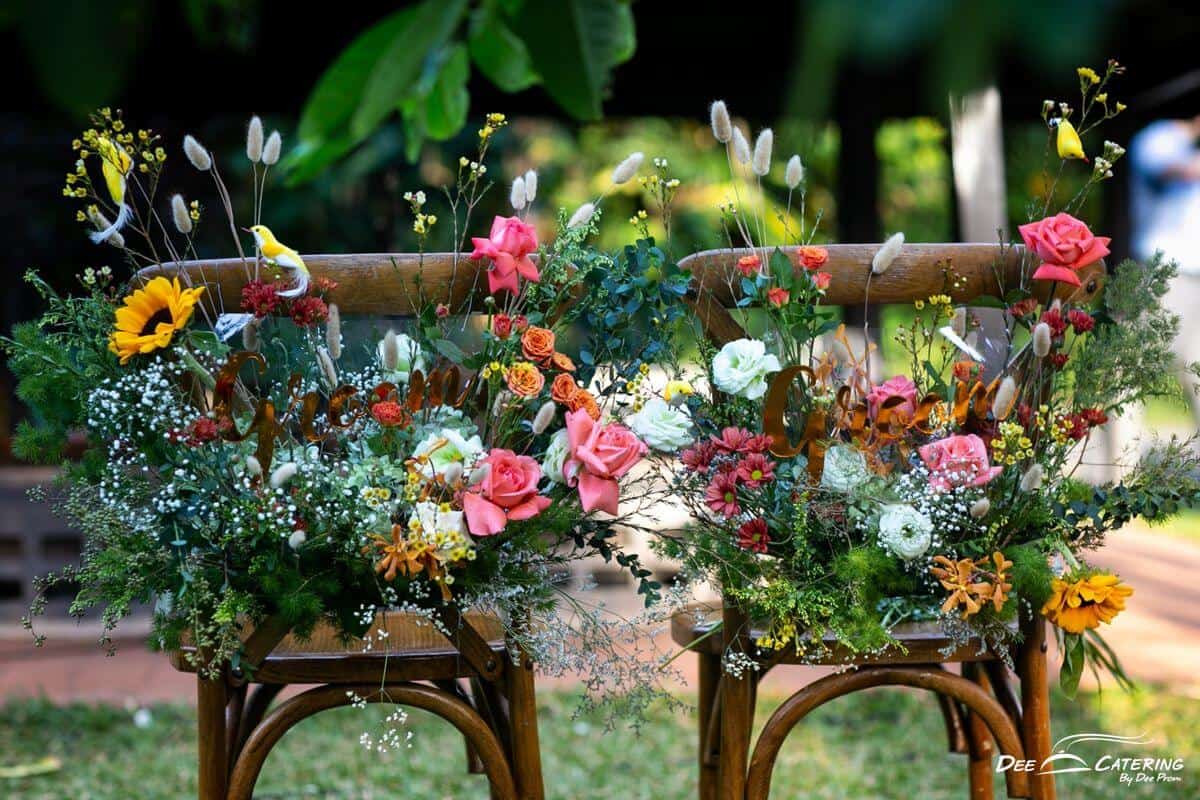 งานแต่งในแบบที่ฝันของคู่นี้ตั้งต้นด้วยโจทย์ที่ต้องการจัดพิธีแต่งงานแบบไทยในบ้านเรือนไทยและจัดเลี้ยงอาหารไทยในสวน จึงเลือกจัดงานที่บ้านหม่อมราชวงศ์คึกฤทธิ์ ซึ่งเป็นสไตล์งานแต่งงานที่ ดี เคเทอริ่ง เคยจัดให้กับคู่แต่งงานชาวต่างชาติที่รักความเป็นไทยแบบสุดๆ ข้อดีของการจัดงานแต่งบ่ายเลี้ยงเย็น คือ บ่าวสาวไม่ต้องตื่นเช้า และแขกที่มาร่วมงานก็มีโอกาสได้เห็นพิธีแต่งงานตั้งแต่เริ่มต้นจนจบงาน ไม่ต้องกังวลว่าจัดเลี้ยงโต๊ะไทยในสวนตอนกลางคืนจะมืดหรือเปล่า เพราะเรามีทีมเซ็ตติ้งไฟที่พร้อมสำหรับการจัดเลี้ยงเอาท์ดอร์กลางคืนให้สวยและโรแมนติก รวมถึงการตกแต่งสถานที่ทั้งหมดของงานนี้ยังได้ คุณใหญ่ อังควร จาก Angkhuan Flower Design ดูแลดอกไม้ทั้งหมดในงาน และความพิเศษอีกอย่างของงานนี้เผื่อจะเป็นไอเดียให้กับบ่าวสาวคู่อื่นๆ คือ เรื่องอาหารในงานทั้งหมดเป็นมังสวิรัติค่ะ เนื่องจากลูกค้าเป็นมังสวิรัติ เราจึงปรับเมนูโต๊ะไทยเป็นอาหารมังสวิรัติทั้งหมด ถือว่ามอบความเฮลท์ตี้เป็นของขวัญให้กับแขกที่มาร่วมงานก็ได้นะคะ