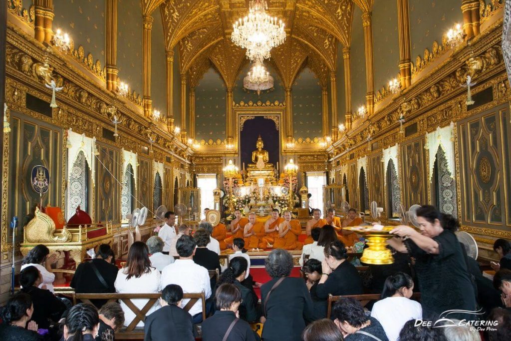 โดยปกติแล้ว เมื่อพูดถึงการทำบุญเลี้ยงพระ เรามักจะคุ้นเคยกับการทำบุญเลี้ยงพระที่บ้าน บางบ้านก็ถือฤกษ์ทำบุญบ้านหรือทำบุญวันเกิดไปพร้อมกันเลย เนื่องจากการจัดเตรียมงานบุญ นิมนต์พระมาสวด การเตรียมอาหารเลี้ยงพระ และไหนจะต้องจัดสถานที่สำหรับทำพิธี เตรียมพื้นที่สำหรับจัดอาหารเลี้ยงแขก นี่ยังไม่พูดถึงตอนเสร็จงาน เดี๋ยวนี้จึงมีหลายคนที่เลือกไปทำบุญวันเกิดที่วัดแทน สะดวกในหลายๆ เรื่อง ไม่ต้องจัดเตรียมสถานที่ แขกที่เดินทางมาร่วมทำบุญยังได้ทำบุญอื่นๆ ได้อีก และเจ้าภาพเองก็สามารถทำบุญเลี้ยงพระได้ทีละหลายๆ รูป หมดกังวลว่าจะตกหล่นอุปกรณ์สำคัญอะไรในพิธี เพราะในวัดมีครบทุกอย่างแน่นอนค่ะ และตอนนี้มีวัดหลายแห่งที่เปิดให้ผู้ที่สนใจสามารถทำบุญวันเกิดภายในวัดได้ ตัวอย่างงานหนึ่งที่ ดี เคเทอริ่ง ได้ดูแลเรื่องการจัดเตรียมอาหารเลี้ยงพระ และยังจัดเตรียมอาหารบุฟเฟต์สำหรับแขกที่มาร่วมทำบุญ เมื่อวัดมีพื้นที่กว้างขวางกว่าการจัดงานที่บ้าน ทำให้สามารถจัดโต๊ะสำหรับตั้งสำรับอาหารถวายพระบนโต๊ะได้เลย ในขณะที่โต๊ะรับประทานอาหารของแขกที่มาร่วมทำบุญก็จัดไว้มุมด้านนอก เดินตักอาหาร Buffet ได้อย่างสะดวกสบาย เสร็จงานทำบุญวันเกิดของเจ้าภาพแล้ว แขกยังถือโอกาสทำบุญอื่นๆ ต่อในวัดได้อีกต่างหาก เรียกว่าสะดวกทั้งเรื่องจัดเตรียมงาน สะดวกสำหรับพระสงฆ์ที่ไม่ต้องเดินทางไปนอกวัด และยังเอื้อประโยชน์ให้แขกที่มาร่วมทำบุญด้วย อิ่มบุญกันไปถ้วนหน้าเลยล่ะคะ