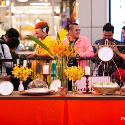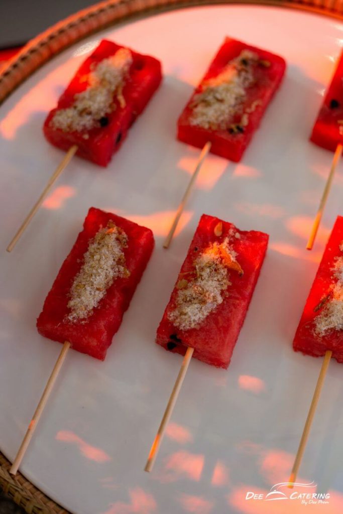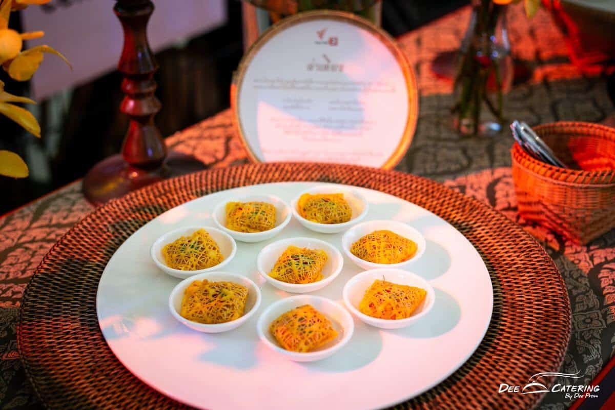 อาหารค็อกเทลไทยที่เลือกมา ได้แก่ ล่าเตียง ขนมจีบนก สะเต๊ะลือ แตงโมปลาแห้ง ทุกเมนูใช้วัตถุดิบและปรุงแบบไทยโบราณขนานแท้ เราใส่ใจรายละเอียดไปถึงการนำเสนอ เช่น สะเต๊ะลือ ที่แต่โบราณจะนำทางมะพร้าวมาทำเป็นไม้เสียบ โดยทำที่จับให้ดูคล้ายคันธนู และเพื่อให้ผู้ร่วมงานได้เข้าใจที่มาที่ไปของเมนูมากขึ้น เรายังมีรายละเอียดของอาหารไว้ให้อ่านกัน และสิ่งที่ขาดไม่ได้เลยคือ เมื่อเป็นงานแถลงข่าวของไทยพีบีเอส ลูกค้าคนสำคัญที่ดี เคเทอริ่ง มีโอกาสได้ดูแลจัดเลี้ยงให้หลายครั้ง ทำให้จดจำรายละเอียดของแบรนด์ได้อย่างดี จึงนำดีเทลเล็กๆ อย่างโทนสีส้มของแบรนด์ หรือการเลือกดอกไม้ Bird of paradise ซึ่งเป็นโลโก้ของ Thai PBS มาตกแต่งไลน์ค็อกเทลอีกด้วย