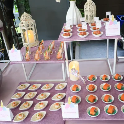 นอกจากดีเคเทอริ่งจะตั้งใจทำอาหารค็อกเทลให้ออกมาอร่อยและน่าทานอย่างสุดฝีมือ ดีเคเทอริ่งก็ตั้งใจ ใส่ใจรายละเอียดในการจัดและตกแต่งไลน์อาหารค็อกเทลให้กับกับการจัดงานวันเกิด Theme Unicron ของน้อง Alice ในครั้งนี้มากๆ ทั้งผ้าปูโต๊ะไลน์อาหารค็อกเทลที่มีความฟรุ้งฟริ้ง ฟูฟ่อง สีชมพู พร้อมป้าย Happy Birthday สีฟ้า หรือจะเป็นในส่วนของธงปักบนอาหารค็อกเทล แก้วใส่ทิชชู่ ช้อน ส้อมเทียนตกแต่งที่ถูกผูกด้วยริบบิ้นสีรุ้ง สิ่งที่จะถูกใจเจ้าของงานวันเกิดมากที่สุดคงจะหนีไม่พ้นพี่ตุ๊กตาม้า Unicorn แสนนุ่มนิ่มที่มาร่วมอวยพรวันเกิดในครั้งนี้ด้วย