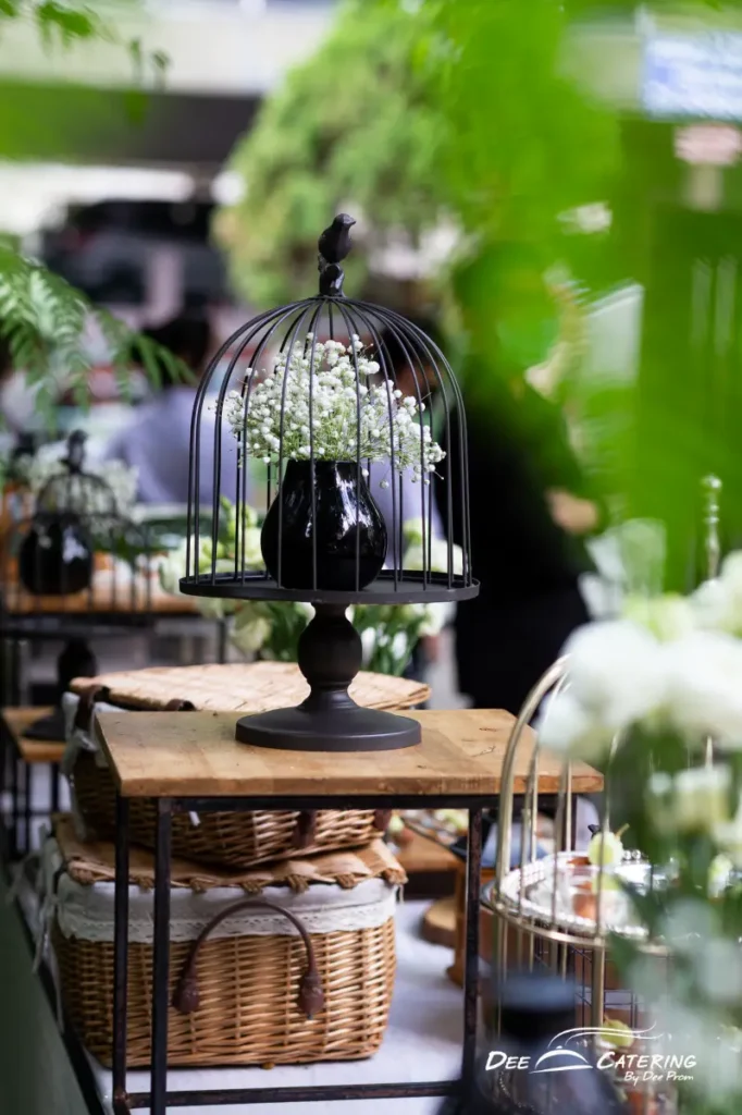 ธีมสีงานแต่งงานในสวนครั้งนี้ถือว่าเป็นอีกงานแต่งงานหนึ่งที่จัดออกมาได้ทรงเสน่ห์ เก๋ เข้ากับสถานที่มาก ๆ ตั้งแต่ดีเทลเล็ก ๆ อย่างการ์ดเชิญ การเลือกสีดอกไม้จัดซุ้มพิธีบ่าวสาว แขกที่มาร่วมงานทุกคนใส่ชุดสีดำแต่ละคนมีสไตล์เป็นของตัวเอง ถือว่าเป็นอีกสีสันหนึ่งของงานแต่งนี้ ดี เคเทอริ่ง ได้รับหน้าที่ช่วยเนรมิตอาหารจัดเลี้ยง สำหรับงานแต่งในสวนนี้ทางบ่าวสาวได้เลือกอาหารจัดเลี้ยงเป็นค็อกเทล (Cocktail) ซุ้มอาหาร (Food Stall) และโต๊ะไทย (Thaitable) อาหารค็อกเทลถูกอยู่บริเวณด้านหน้าโบสถ์ บนโต๊ะไลน์อาหารถูกตกแต่งคุมโทนด้วยสีขาว-ดำ ทั้งแจกันดอกไม้ ป้ายเมนู ผ้าคลุมโต๊ะเลือกใช้สีขาว ตัดขอบด้วยริบบิ้นสีดำ และเลือกที่วางอาหารค็อกเทลเป็นไม้เพื่อให้เข้ากับงานแต่งในสวนและให้โต๊ะอาหารมีลูกเล่นมากขึ้น เพิ่มความนุ่มนวลด้วยดอกยิปโซสีขาว เมื่อพิธีใกล้จะเริ่ม อาหารค็อกเทลก็ถูกนำออกมาเรียงรายไว้บนโต๊ะกลางสวนอย่างสวยงาม พอทุกอย่างครบองค์ประชุม งานแต่งในสวนก็ได้เริ่มต้นขึ้นอย่างอบอุ่นและจบลงอย่างสวยงาม หลังพิธีจบแขกที่มาร่วมแสดงความยินดี สามารถเดินมาหยิบทานอาหารค็อกเทลได้อย่างสะดวก ทางบ่าวสาวได้เลือกอาหารจัดเลี้ยงแบบโต๊ะไทย (Thaitable) สำหรับแขกผู้ใหญ่ ซึ่งจะอยู่ในบริเวณอาคารสีขาว ปกคลุมไปด้วยต้นไม้สีเขียวของอะกาลิโก อุปกรณ์บนโต๊ะถูกเตรียมไว้อย่างดีตามที่ได้รับรีเควสมา ทั้งผ้าเช็ดปากผูกด้วยริบบิ้นสีดำ ป้ายโต๊ะสีดำสำหรับระบุที่นั่งสำหรับแขกคนสำคัญ ส่วนเมนูโต๊ะไทยคงถูกปากถูกใจแขกผู้ใหญ่ไม่ใช่น้อย อาทิเช่น แกงส้มปลากะพงยอดมะพร้าว ผัดเรือโป๊ะ ส้มตำปลาดุกฟู