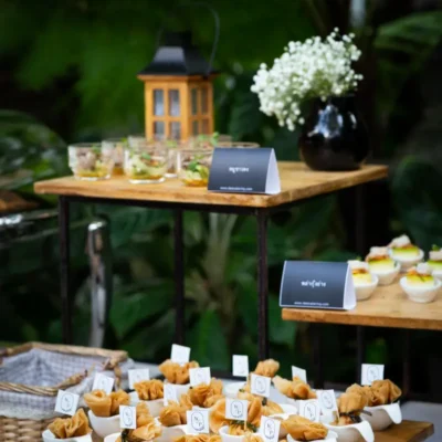 เพียงเท่านั้นยังไม่พอสำหรับการจัดงานแต่งในสวนที่พื้นที่มีหลายโซนและสวยแบบนี้ยังมี ซุ้มอาหาร (Food Stall) ที่เตรียมอยู่ท่ามกลางกลางสวนด้านหลังโบสถ์ รายล้อมด้วยตึกที่มีความสวยเหมือนอยู่ในเทพนิยาย ตามที่บ่าวสาวได้เลือกมาเมนูซุ้มอาหารจะเป็นเมนูจัดเลี้ยงแบบไทย อาทิเช่น ผัดไทย ข้าวมันไก่ต้มเครื่องแน่น และเกี๊ยวน้ำที่ทำสด ๆ ร้อนจากเตาด้วยเชฟจาก ดี เคเทอริ่ง หอมหวน ชวนรับประทาน สำหรับคนที่ไม่อิ่มจากค็อกเทลสามารถมาเติมท้องให้เต็มต่อได้ที่ซุ้มอาหารได้