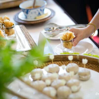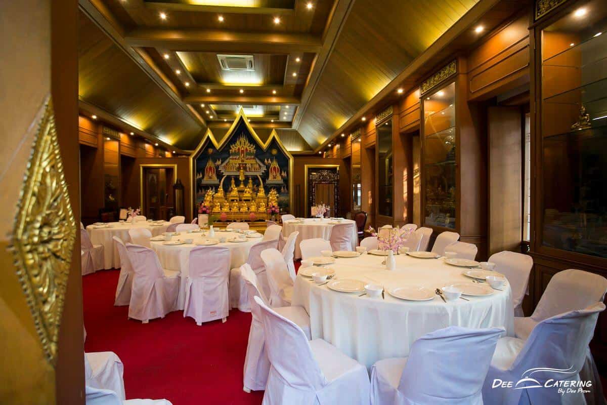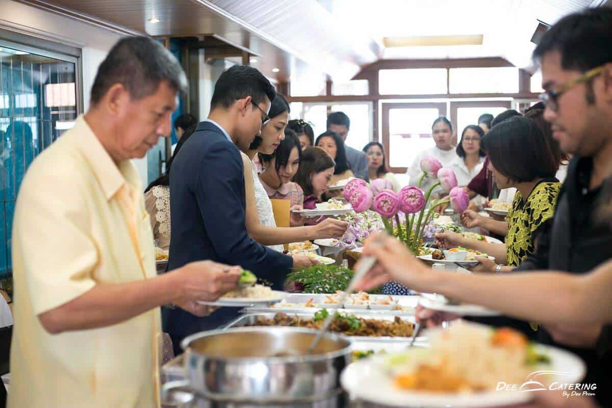 ข้อดีของการจัดงานแต่งงานในวัด คือ ไม่ต้องกังวลเรื่องนิมนต์พระ หรืออุปกรณ์ประกอบพิธีทางศาสนาต่าๆ และยังง่ายเรื่องการจัดเตรียมสำรับอาหารเลี้ยงพระ บ่าวสาวสามารถถวายอาหารบนโต๊ะ และยังถวายอาหารเลี้ยงพระได้หลายรูป ตัวอย่างงานแต่งแบบเรียบง่ายของบ่าวสาวคู่นี้น่าจะทำให้ว่าที่บ่าวสาวที่สนใจเห็นภาพชัดขึ้น งานแต่งงานจัดที่วัดโพธิ์ งานแต่งพิธีเช้าจัดเบรคไทย แน่นอนว่า ดี เคเทอริ่ง ต้องเลือกเมนูอาหารมงคลมาเสิร์ฟ อาทิ ถุงทอง หยิบจับอะไรเป็นเงินเป็นทอง ขนมกล้วย ทุกอย่างในชีวิตคู่จะกลายเป็นเรื่องง่ายๆ กล้วยๆ หรือ ลอดช่อง ก็ยังหมายถึงความราบรื่นไม่มีอุปสรรคเช่นกัน ส่วนอาหารบุฟเฟต์มื้อกลางวันก็ต้องครบทั้งความอร่อย ความหลากหลาย และความมงคล เช่นกัน การจัดงานแต่งงานในวัดจึงเต็มไปด้วยความมงคลตั้งแต่สถานที่จัดงาน อาหารที่เลือกก็ล้วนเป็นอาหารมงคล บ่าวสาวได้ทำพิธีมงคลครบถ้วน แขกที่มาร่วมงานก็ได้ร่วมพิธีภายในสถานที่มงคล ที่สำคัญใช้งบไม่เยอะอีกด้วยค่ะ