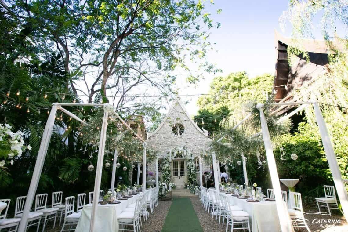 อีกหนึ่งสถานที่จัดงานแต่งงานในฝันของว่าที่เจ้าสาว เพราะสามารถเนรมิตได้ทั้งงานแต่งงานอินดอร์และเอาท์ดอร์ ทุกพื้นที่อบอวลไปด้วยกลิ่นอายของความโรแมนติก ชวนฝัน ตั้งแต่ตัวบ้านสีขาวสไตล์โคโลเนียล ภายในสามารถตกแต่งให้เป็นสถานที่จัดเลี้ยงสำหรับพิธีแต่งงานเล็กๆ พื้นที่ชั้นบนใช้เป็นห้องแต่งตัวหรือห้องรับรองผู้ใหญ่ก่อนจะเริ่มงานก็ได้ จึงให้อารมณ์เหมือนจัดงานแต่งงานที่บ้าน แต่ถ้าอยากได้ฟีล Cozy ขึ้นมาอีกนิด สวนสไตล์ยุโรป ที่มีน้ำพุกลางสวน โดยมีฉากหลังเป็นโบสถ์สีขาว บริเวณนี้ช่วงเช้าหากจะจัดเป็นพิธีเลี้ยงพระหรือรดน้ำสังข์ก็เหมาะ ถ้ากลัวฟ้าฝนไม่เป็นใจย้ายมารดน้ำสังข์ในโบสถ์สีขาวก็ได้ หรือจะเป็นพิธีสวมแหวนช่วงแดดร่มสักหน่อยก็ได้ฟีลโรแมนติกเหมือนในหนังฝรั่ง